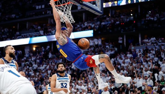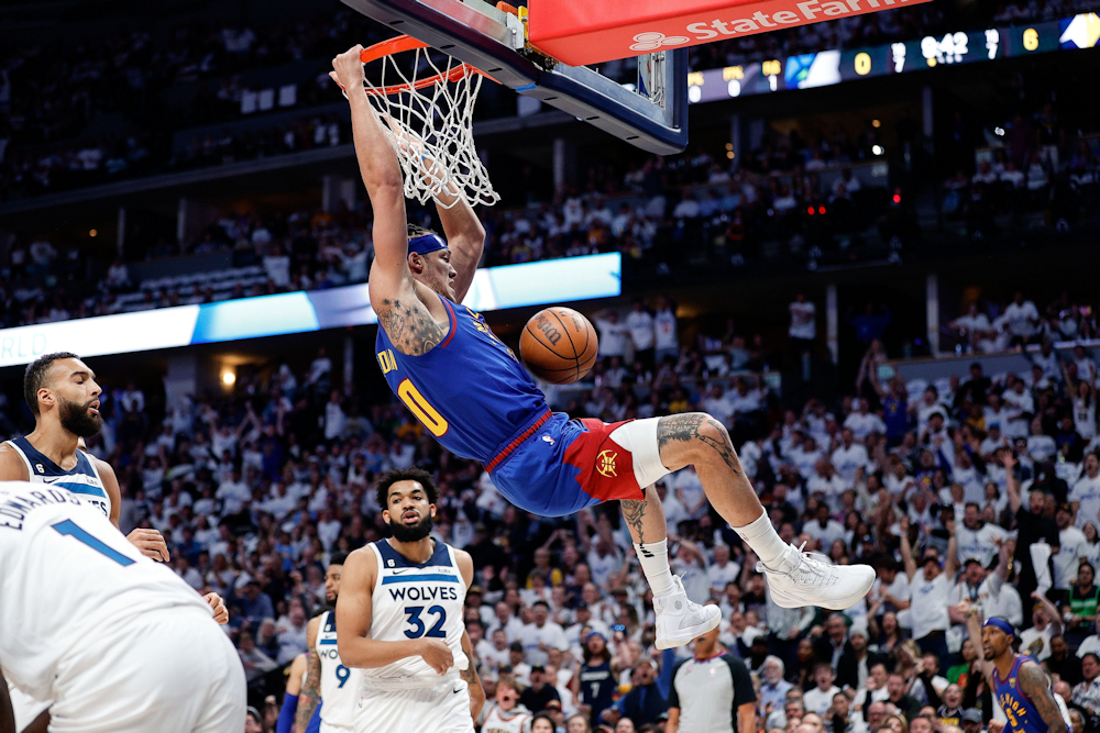Denver a commencé pied au plancher avec un 3-points de Michael Porter Jr, un autre de Aaron Gordon et un dunk tout en puissance du même Gordon. Dans une Ball Arena toute vêtue de blanc, les Nuggets remportent le premier quart (26-23) mais Minnesota n’est pas loin grâce à Anthony Edwards puis Kyle Anderson.