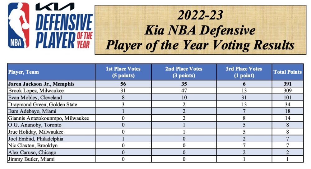 Préféré à Brook Lopez et Evan Mobley, les deux autres finalistes de ce trophée, l’intérieur de Memphis succède donc à Marcus Smart, sacré en 2022. À seulement 23 ans, il n’est autre que le deuxième plus jeune DPOY de l’histoire, derrière Dwight Howard, également âgé de 23 ans en 2009, mais encore plus précoce de quelques jours.