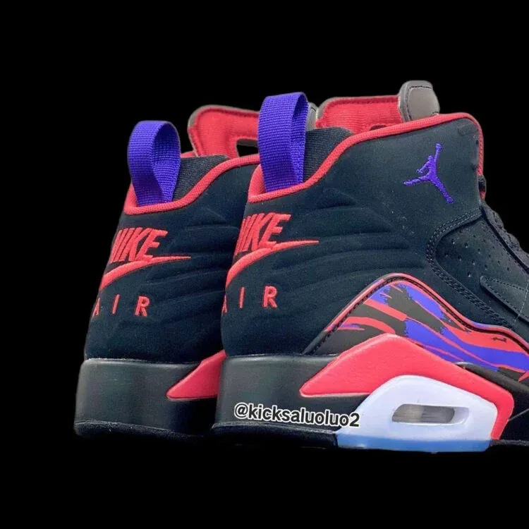 Cette version « Raptors OG » se caractérise par ses finitions en rouge et violet pour accompagner une tige en nubuck noir. L’inscription Nike Air en rouge, et la tirette ainsi que les logos « Jumpman » en violet complètent l’ensemble reposant sur une semelle également assortie de rouge.