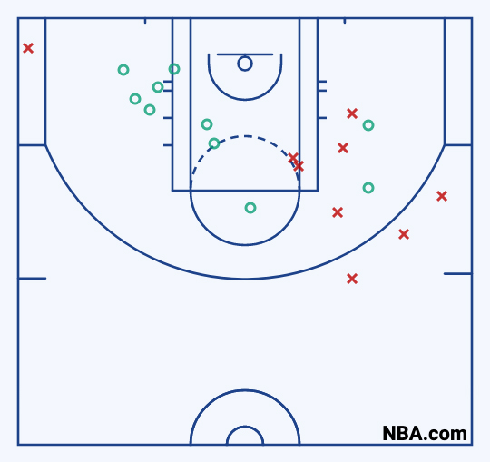 La carte des shoots de Kevin Durant sur ce Game 2 est assez étonnante. Car l’ailier de Phoenix a quasiment tout réussi au milieu et à gauche du panier (8/9), et quasiment tout raté à droite (2/10).