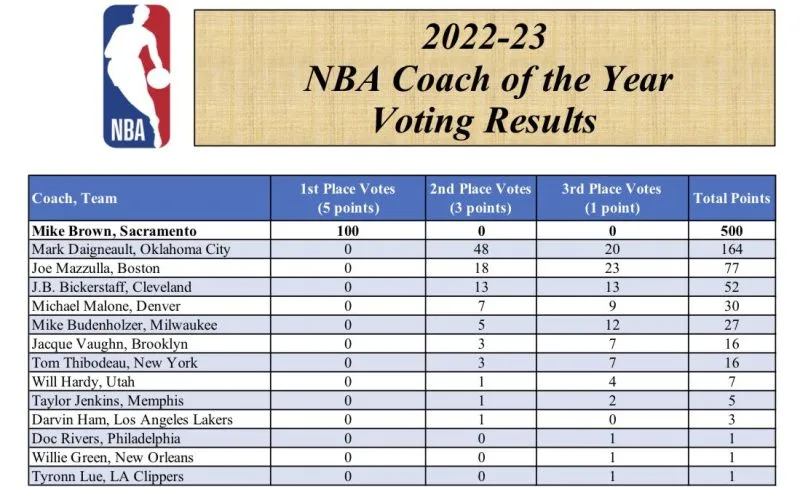 /https%3A%2F%2Fwww.basketusa.com%2Fapp%2Fuploads%2F2023%2F04%2FUSATSI_20248499-scaled-e1681921953185.jpg) Après De'Aaron Fox, élu « Clutch Player of the Year » hier soir, c'est au tour d'un autre membre des Kings d'être récompensé par la NBA et, là encore, il s'agit d'un sacre logique et attendu. En effet, Mike Brown a été désigné « Coach of the Year » 2023 aux dépens de Mark Daigneault (Thunder) et Joe Mazzulla (Celtics).