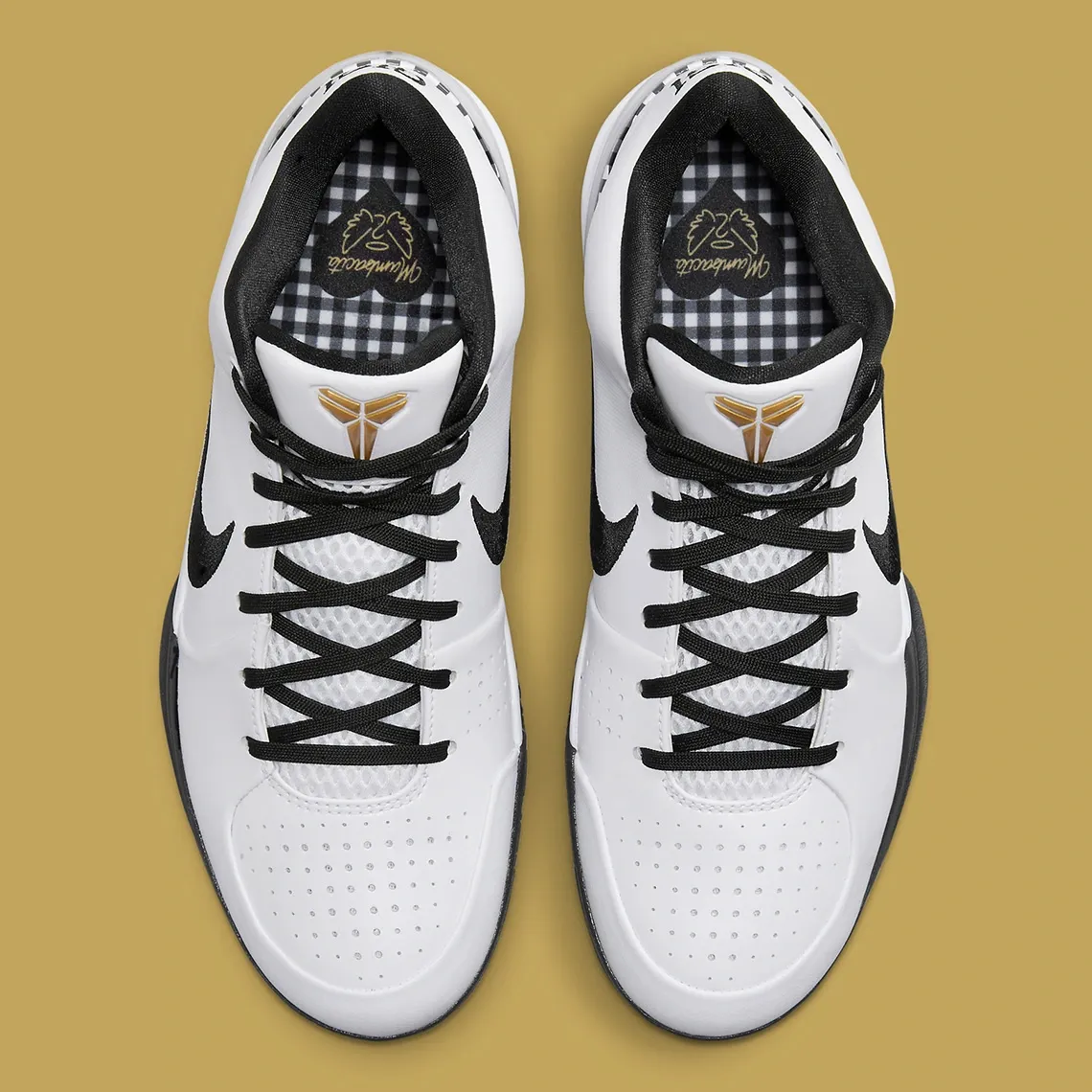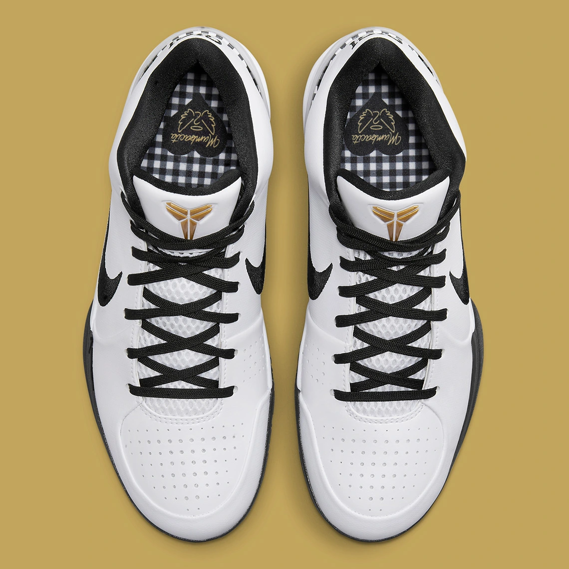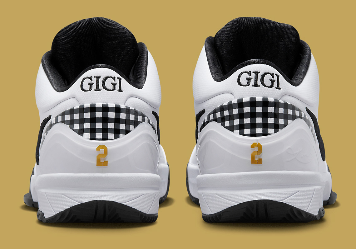 D’après les images officielles dévoilées cette semaine, celle-ci se présente avec une base en cuir blanc et des touches de noir, comme sur la virgule, ou le tissu écossais parcourant le talon. Le logo de Kobe Bryant sur la languette et le numéro 2 portée par Gigi sur le talon ressortent en doré, l’ensemble reposant sur une semelle noire et blanche.