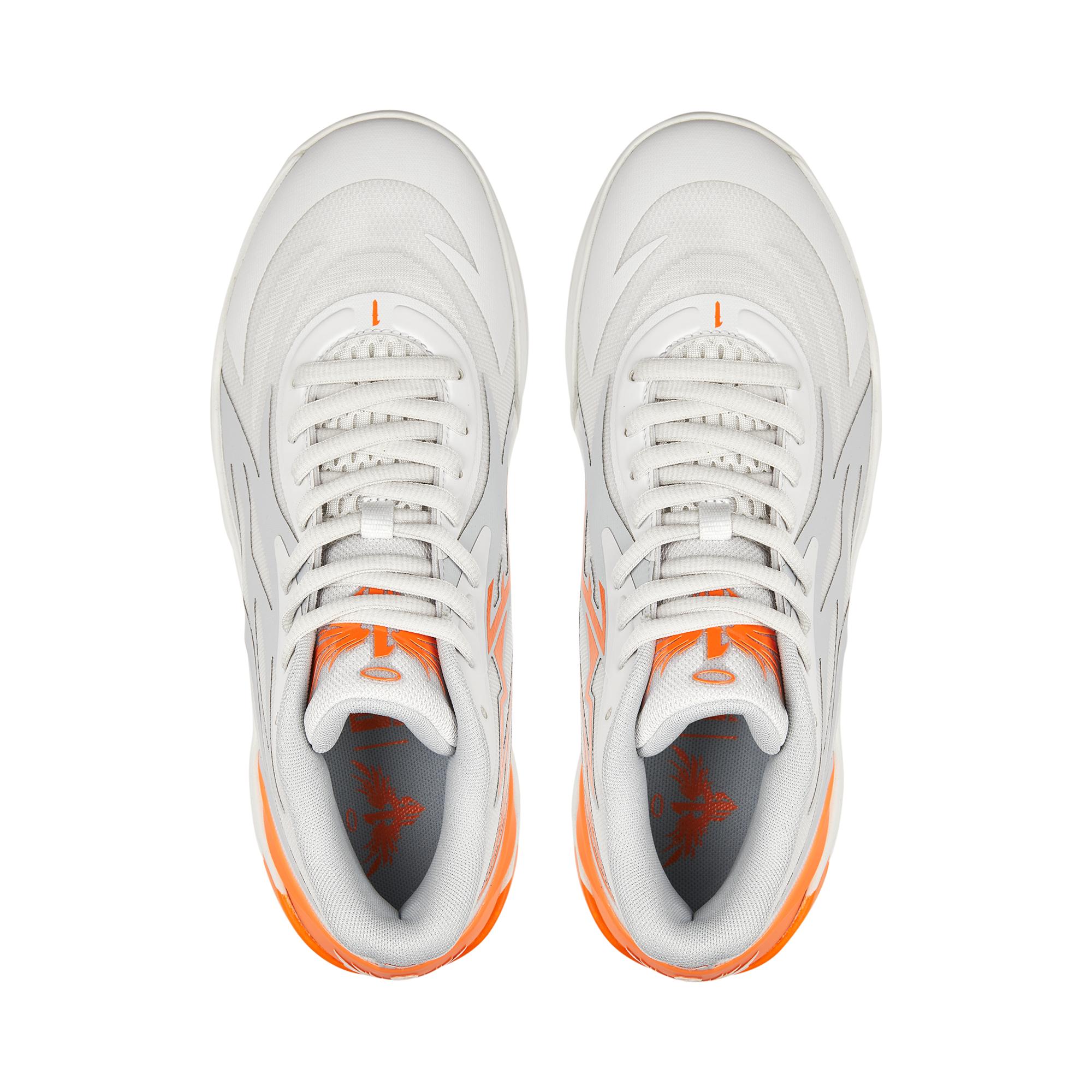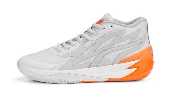 Après avoir ressorti un modèle « Camo » de la MB.01, c’est au tour de la MB.02 d’être présentée sous un nouveau coloris. Baptisé « Gorange », celui-ci se distingue par sa tige en blanc, sur laquelle les « ailes » chères à LaMelo Ball sur l’empeigne ressortent en gris et orange. Les finitions comme les logos ou l’inscription « M.E.L.O. » ainsi que l’arrière de la semelle apparaissent également en orange.