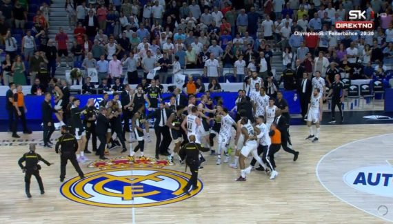 S’en est suivie une grosse bagarre au cours de laquelle on a notamment vu le Madrilène Guerschon Yabusele faire une prise de MMA à Dante Exum en le projetant violemment au sol. L’Australien souffre d’une rupture d’un ligament au pied d’après le médecin du Partizan, Moma Jakovljevic, et sa lèvre supérieure a également été touchée.