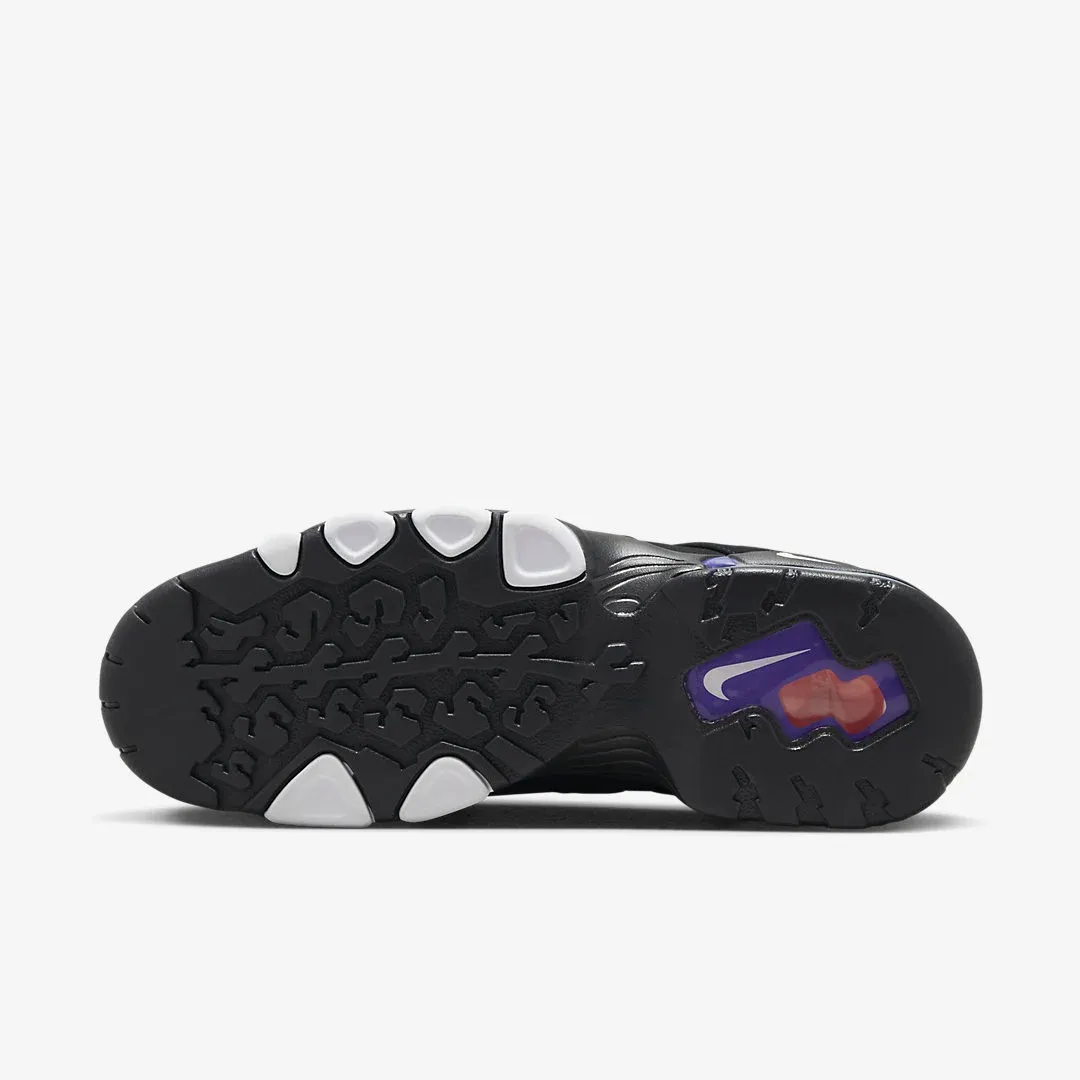 La tige est composée d’un cuir blanc recouvert de bandes en nubuck noir, tandis que la touche de violet ressort sur la languette. Dotée d’une unité « Air Max », la semelle est également en noir, blanc et violet.