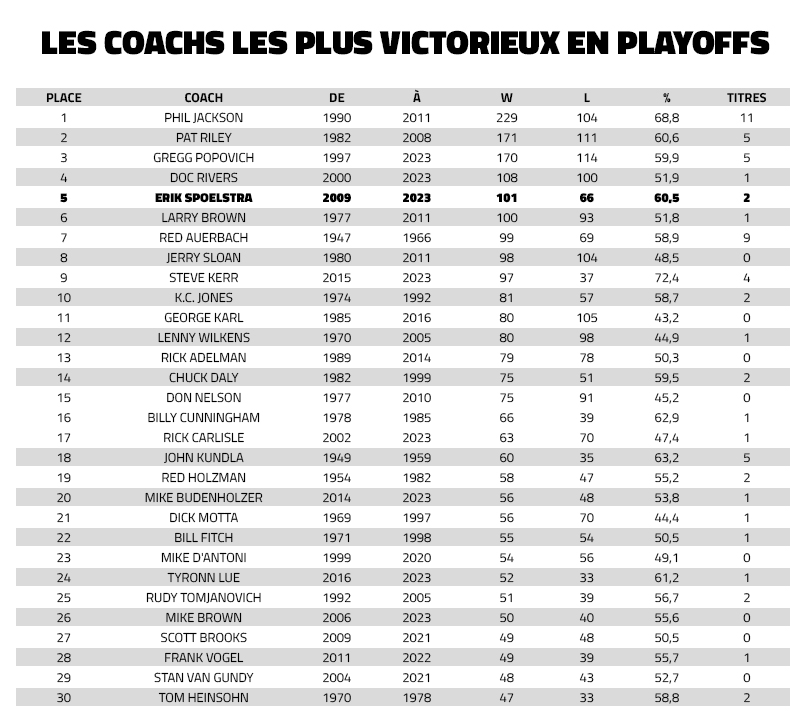 Phil Jackson, Pat Riley, Gregg Popovich et Doc Rivers. Voici les quatre seuls coachs à avoir remporté plus de matchs de playoffs qu'Erik Spoelstra, qui a intégré le Top 5 des entraîneurs les plus victorieux en postseason.