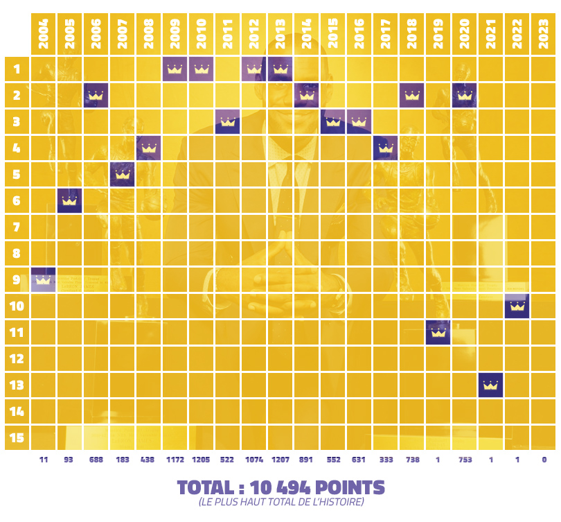 Un classement à la valeur relative puisque les modalités du vote ont souvent changé, le nombre de points récoltables augmentant au fil des ans. De quoi handicaper les anciennes gloires.