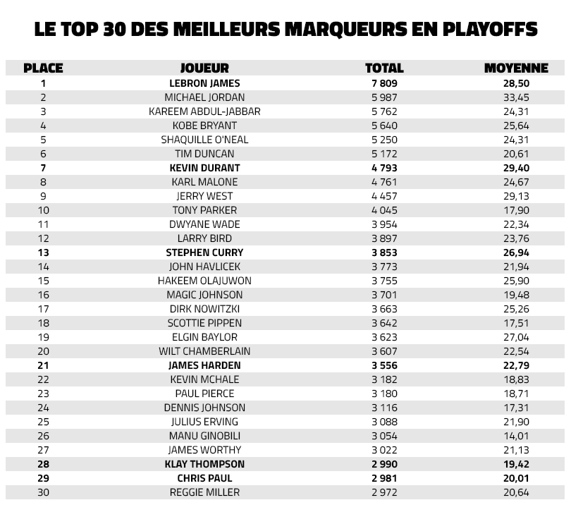 Petit plus de cette soirée, le MVP 2014 est devenu le septième meilleur marqueur de l’histoire des playoffs. Il n’avait besoin que de huit points pour dépasser Karl Malone et le voilà désormais avec 4 793 points au compteur, devant les 4 761 du “Mailman”.