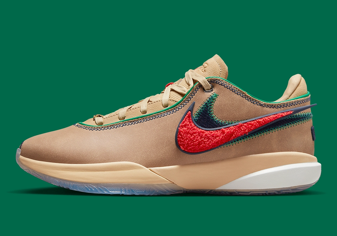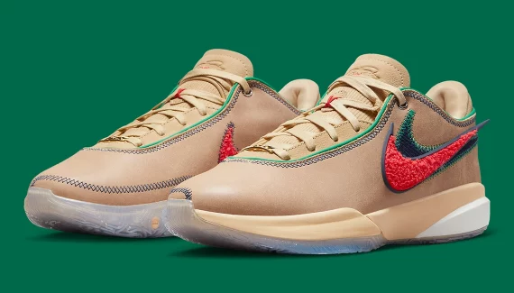 On retrouve en effet une tige en nubuck marron clair sur laquelle repose les deux « Swoosh » superposés, l’un en chenille rouge vif, l’autre en daim bleu marine. Une bande en cuir beige sert d’accroche pour les œillets, tandis que d’infimes finitions en bleu, sur les coutures et en vert au niveau du col, complètent l’ensemble reposant sur une semelle extérieure translucide.