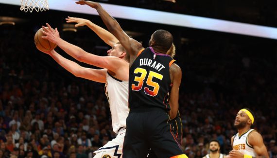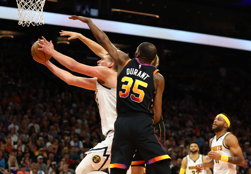 Le trio Nikola Jokic – Jamal Murray – Michael Porter Jr avait permis à Denver de prendre neuf points d’avance grâce à un 13-2 cinglant en premier quart temps, mais Kevin Durant et Devin Booker marquent 24 des 32 points de leur équipe pour garder les Suns au contact (34-32). Malgré le festival de Nikola Jokic, auteur de 15 points en deuxième quart-temps, ce sont deux lancers de Kevin Durant qui mettent Phoenix devant à la pause (63-61).