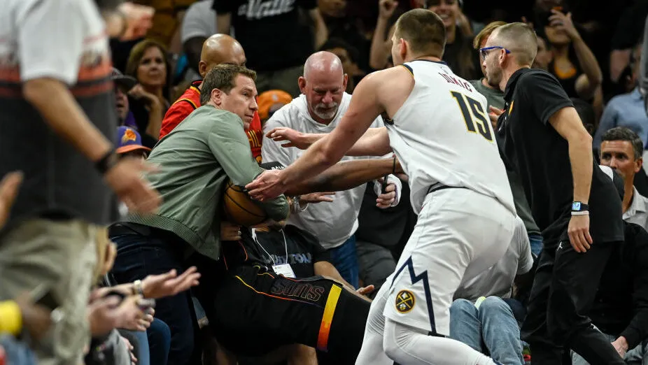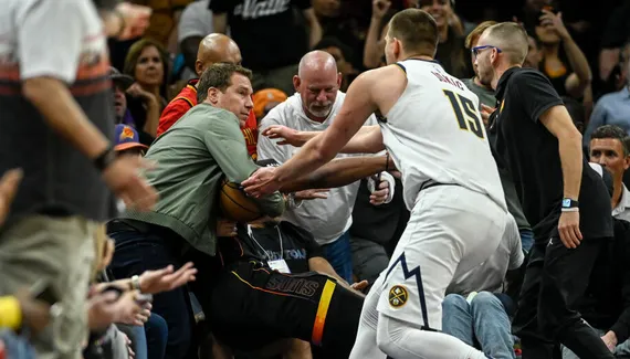 Le pivot essaye d'arracher la balle dans les mains d'un fan des Suns qui veut la conserver. La balle s'envole entre les deux hommes et le fan, qui est désormais debout, est repoussé sur son siège du bras par le double MVP. Résultat : le joueur de Denver prend une faute technique.