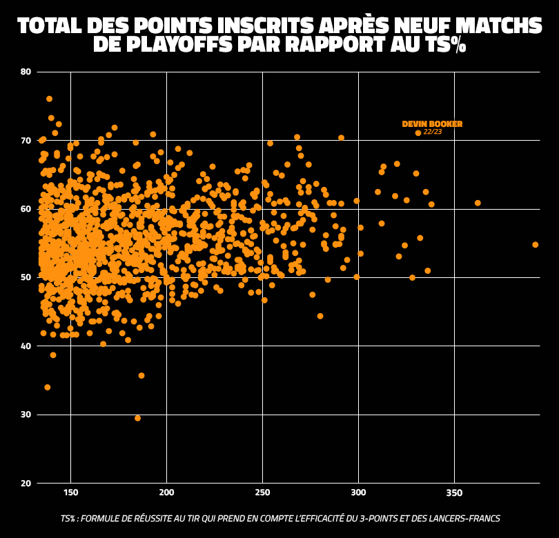 Si on représente le total de points inscrits sur les neuf premiers matchs en playoffs par rapport au TS% (qui prend en compte l’efficacité du 3-points et les lancers-francs), on voit ainsi que personne n’ayant cumulé plus de 200 points n’a jamais été aussi efficace au scoring lors de ses neuf premiers matchs de playoffs.