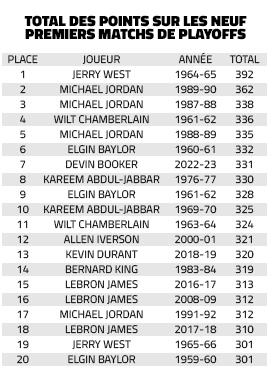 Avec ses 331 points inscrits sur les neuf premières rencontres de la postseason, Devin Booker se place pourtant en 7e position en terme de scoring sur ce laps de matchs, derrière seulement Jerry West (392 points en 1964/65), Michael Jordan (362 points en 1989/90, 338 points en 1987/88 et 335 points en 1988/89), Wilt Chamberlain (336 points en 1961/62) et Elgin Baylor (332 points en 1960/61), mais donc avec une meilleure efficacité.