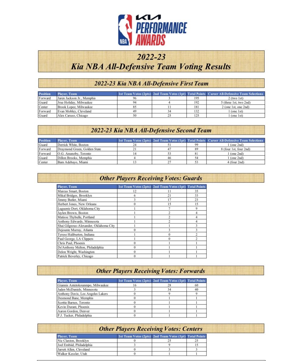 Quant à la « All-Defensive Second Team », elle se compose de Derrick White (Celtics), Dillon Brooks (Grizzlies), OG Anunoby (Raptors), Draymond Green (Warriors) et enfin Bam Adebayo (Heat).