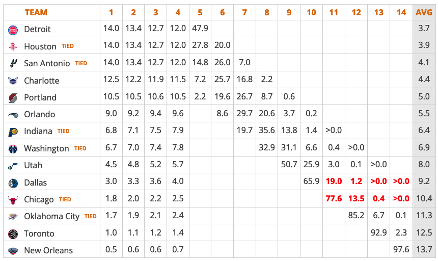 Pour rappel, les Blazers ont 10.5% de chances de récupérer le premier choix, seul Detroit (14%), Houston (14%), San Antonio (14%) et Charlotte (12.5%) ayant plus de chances de mettre la main sur le “first pick” de la cuvée.