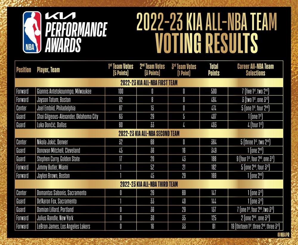 En attendant la saison prochaine pour la disparition des postes dans les « All-NBA Teams », il fallait encore choisir entre Joel Embiid (Sixers) et Nikola Jokic (Nuggets) comme pivot de la « All-NBA First Team ». Sans trop de surprise, c’est le MVP 2023 qui a finalement été préféré au MVP 2021 et 2022, pour ce qui constitue sa première sélection dans le meilleur cinq de la saison (après quatre apparitions dans le deuxième meilleur).