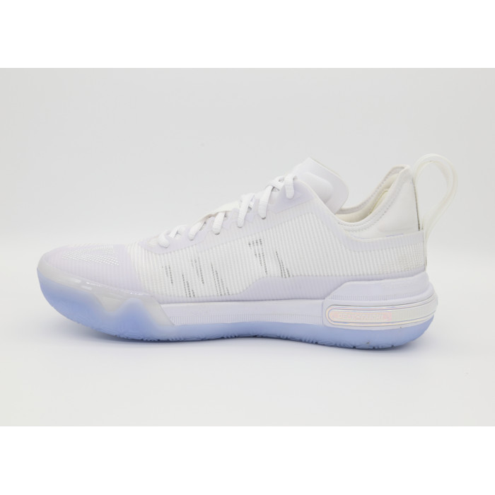 La tige en mesh aérée en mesh TPU est complétée d’un film thermofusible sur l’avant du pied et d’une base également renforcée en TPU. Le logo sous forme de la triangle de la marque Peak est bien visible sur l’empeigne et l’avant du pied. Celui du joueur est présent au niveau de la languette.