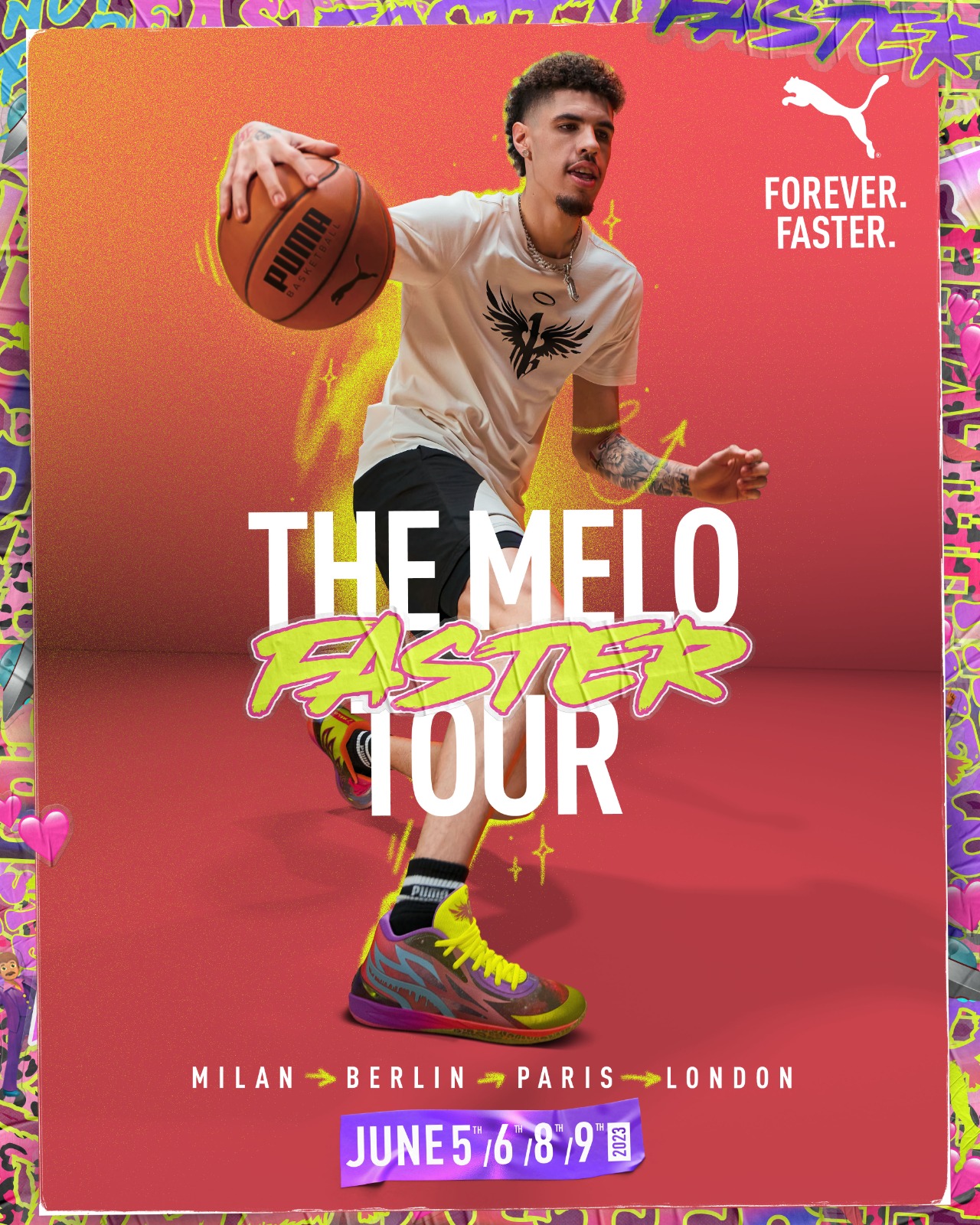 Le « Melo Faster Tour », tel est le nom de la tournée promotionnelle organisée par Puma pour LaMelo Ball. Ce dernier va se rendre du 5 au 9 juin dans quatre villes européennes : Milan le 5, Berlin le 6, Paris le 8 et Londres le 9.
