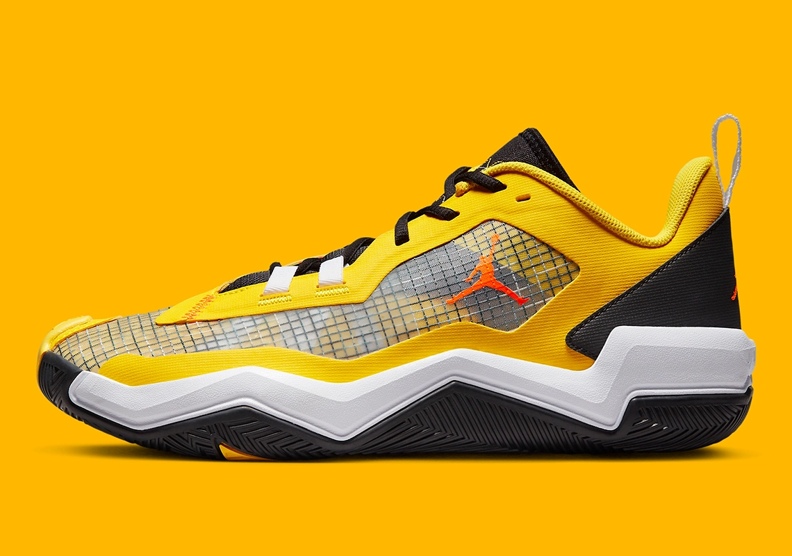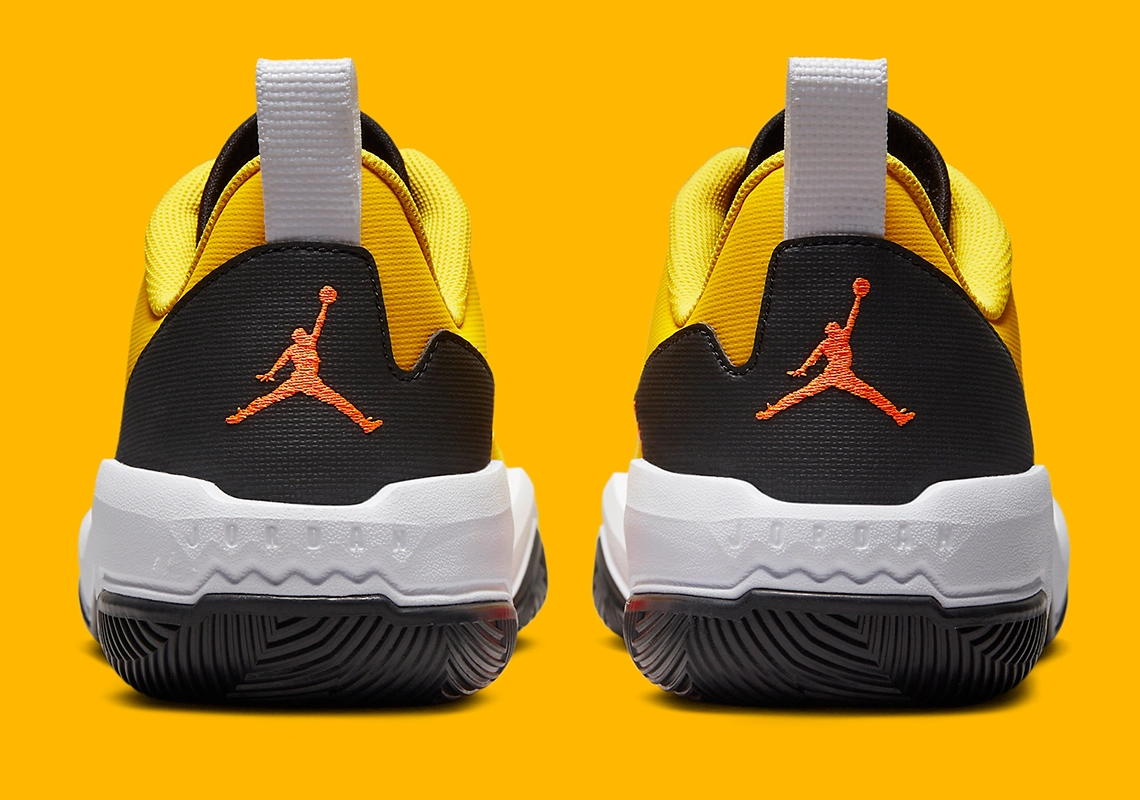 Les couches jaunes sont principalement présentes sur l’empeigne et le col en mesh tandis que le les parties noires figurent au niveau du talon et de la languette. La semelle ressort également en noir, jaune et blanc, tandis que le « Jumpman » apparaît en orange sur l’empeigne et au niveau du talon.