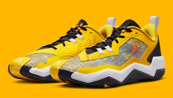 Après après commercialisé des coloris bleus, un rose et un « Bred », voici une Jordan One Take 4 en mode taxi, en noir et jaune, une association classique chez la marque au « Jumpman ».