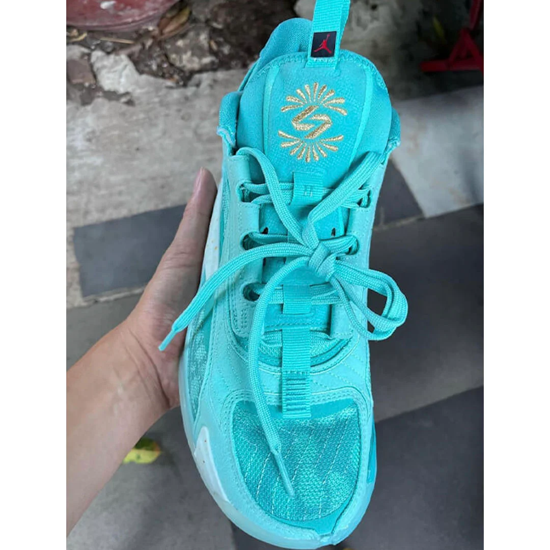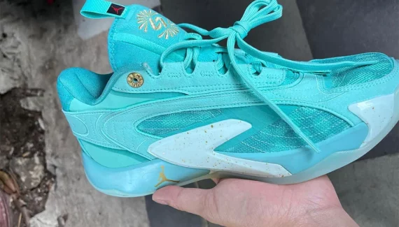 En attendant, voici un nouveau coloris de la deuxième paire chaussure signature du meneur slovène. Celui-ci se présente en différentes teintes de bleu ciel en mesh, daim et cuir sur la tige, avec une semelle intermédiaire tachetée et des motifs ressortant en doré, que ce soit le logo du joueur ou le « Jumpman » figurant sur la semelle. La semelle est équipée du support IsoPlate et d’un amorti Formula23.