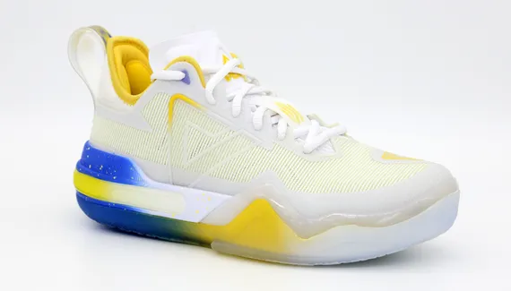 La paire est pour l'instant disponible en quatre coloris dont cet élégant « White Blue » en blanc, bleu et jaune, reprenant les couleurs historiques de la franchise de Golden State.