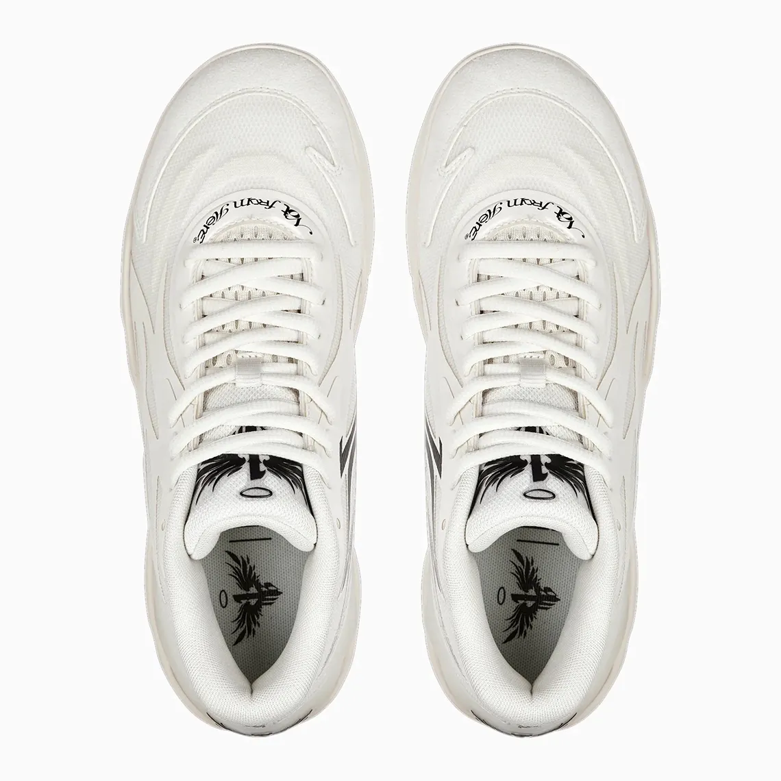 La tige et la semelle mêlent en effet deux teintes d'un blanc ivoire, tandis que les finitions, comme l'inscription « M.E.L.O. » sur le talon ou le logo du joueur sur la languette, apparaissent en noir.