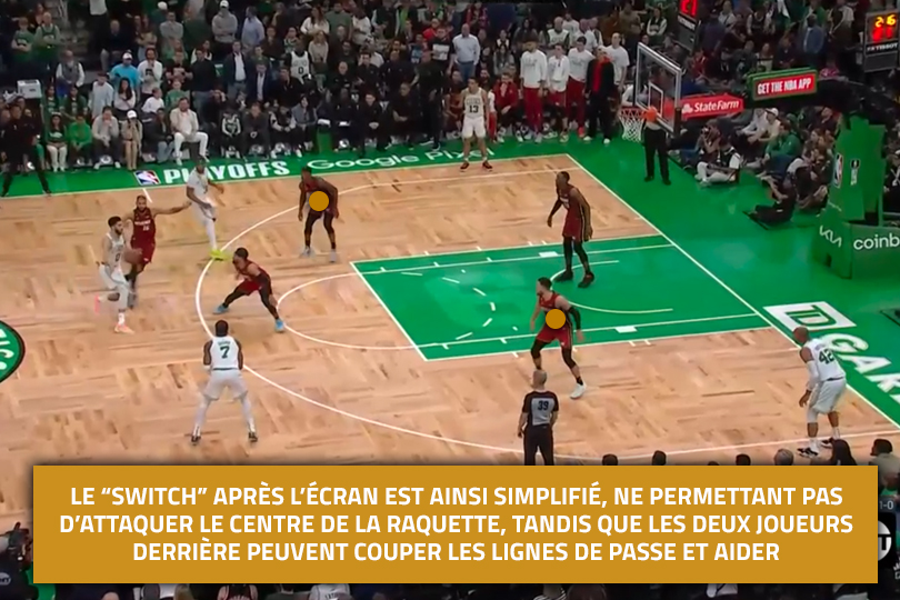Une stratégie qui empêche l’attaque par le centre face à des défenseurs plus faibles, tout en permettant de “cacher” les défenseurs faibles, comme le notait Jaylen Brown, et notamment Duncan Robinson. Derrière la première ligne de défense, le shooteur a ainsi pour but principal d’aider et de couper les lignes de passe.