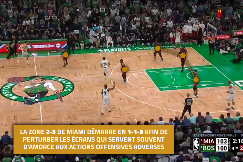 Le Heat est en effet une équipe particulière, dont la défense change constamment. Et sa zone 2-3 est aussi particulière puisqu’elle démarre en 1-1-3 afin de pouvoir “switcher” facilement sur l’écran initial.