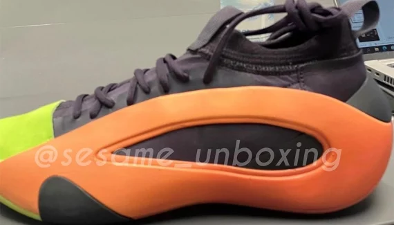 La paire semble s’inspirer de la tige de la Harden Vol. 7 sous forme de chausson avec une superposition sur l’avant du pied et au niveau du talon. La grande nouveauté serait donc ce large renfort latérale en TPU remontant de la semelle sur l’empeigne, en orange sur la première photo, gris sur la deuxième.