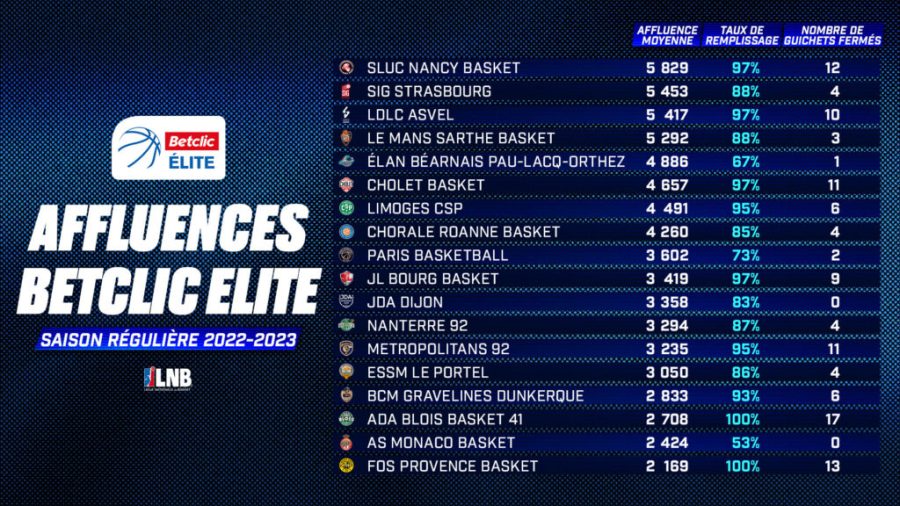 1,2 million de personnes. C’est le nombre total de spectateurs à avoir fréquenté les salles de Betclic Elite cette saison, ce qui représente un nouveau record pour le championnat de France. Chaque match a attiré en moyenne 3 910 spectateurs, le SLUC Nancy s’étant même emparé d’un record pour un club avec une moyenne à 5 829 spectateurs.