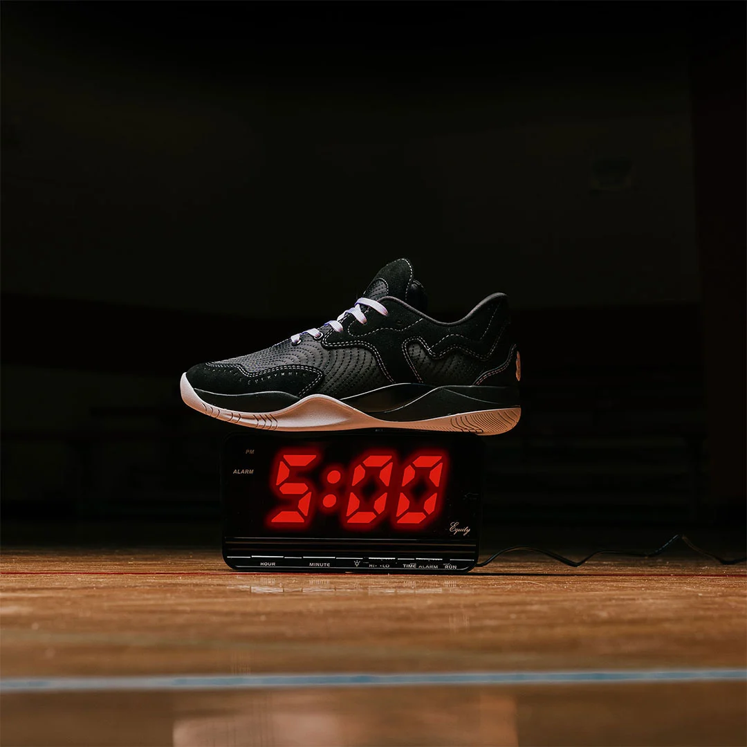 Baptisé « 5am », ce dernier rend hommage à ceux qui se lèvent au crépuscule se perfectionner à l’entraînement. On retrouve donc une tige entièrement noire, avec des lacets et la marque sur le talon en violet et un renfort latérale gris, la paire reposant sur une semelle extérieure également grise.