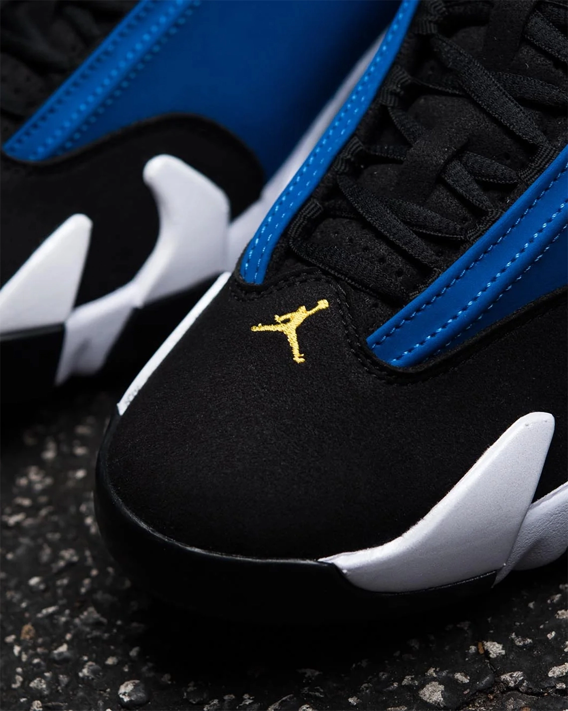 La paire se distingue par sa tige en daim couleur bleu nuit avec l’avant de la chaussure en noir. La touche dorée figure sur le « Jumpman » au bas des lacets et le « Jordan » en haut de la languette.