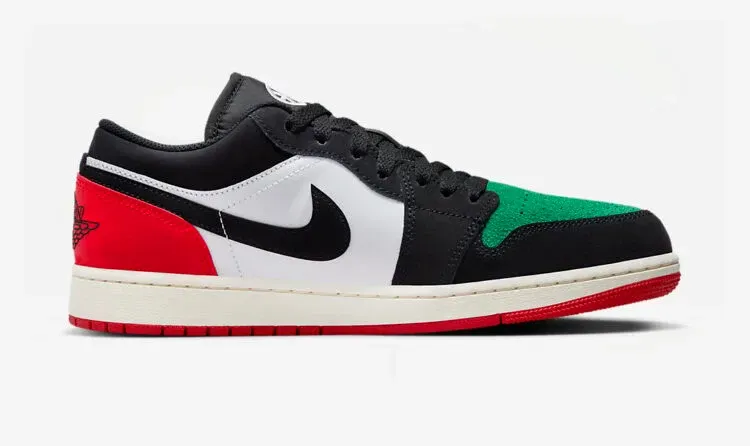 Le code couleur est similaire sur cette AJ 1, avec ces spécificités, une base en cuir recouverte de bandes en daim noir. L’avant du pied ressort en rouge sur la chaussure droite, vert sur la gauche, et inversement au niveau du talon. Les logos du Quai 54 et le « Jumpman » ressortent en blanc sur fond noir sur la languette. Un gros pendentif sur lequel on peut lire « 2003 – 2023, 20 years in the game » est également accroché aux lacets.