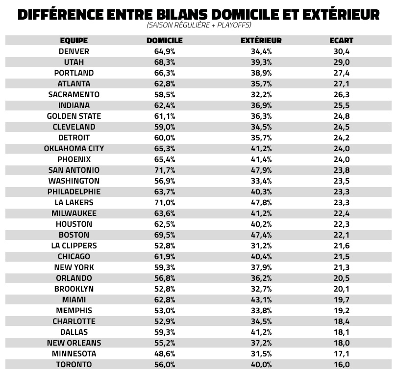 ESPN note d’ailleurs que les Nuggets ont un taux de victoire à domicile (saison régulière) de 65.2% depuis leur arrivée en NBA. Hors de Denver, le pourcentage de succès n’est que de 35%, soit une différence de 30.2 points de pourcentage entre les victoires à domicile et à l’extérieur. L’écart le plus important pour une franchise en activité.