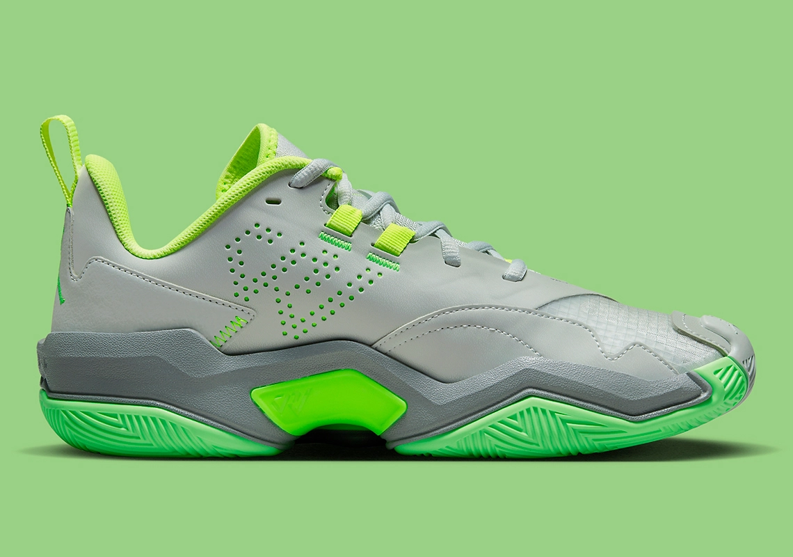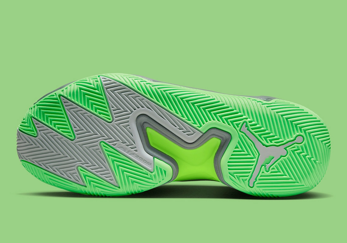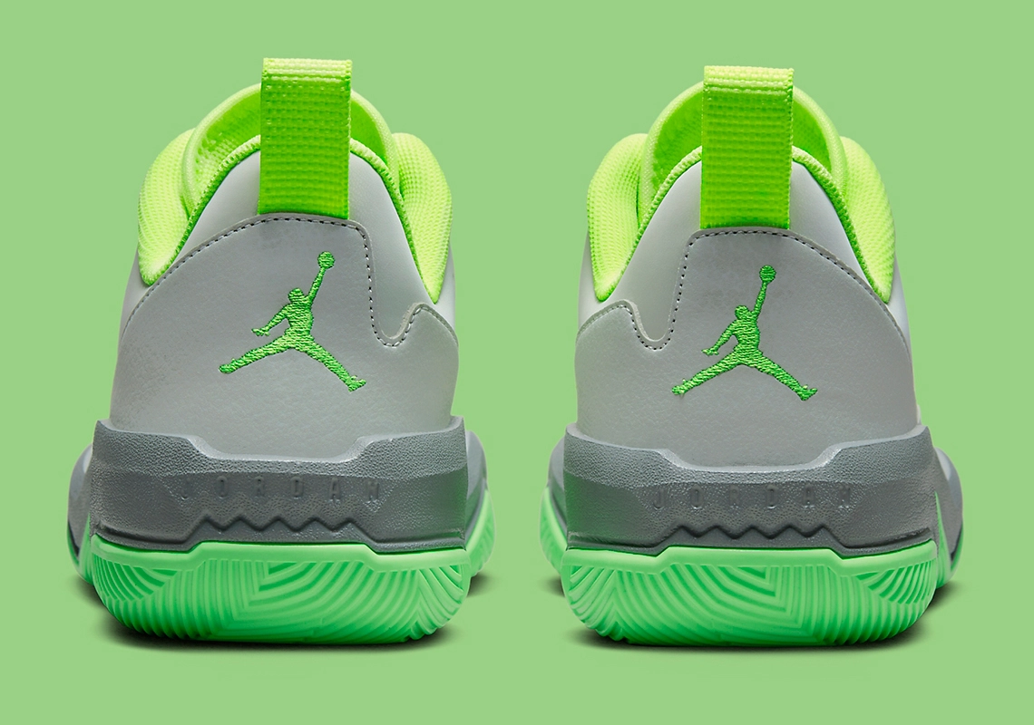 On retrouve différents tons de vert, avec du Volt sur les accroches des lacets, le col, le contour de la languette et la tirette, un autre vert plus foncé sur le « Jumpman » présent sur l’empeigne, et un vert plus clair pour orner la semelle extérieure. La tige et la semelle intermédiaire en gris complètent l’ensemble.