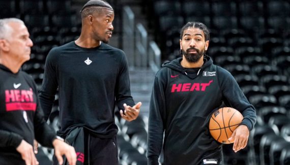 Puis, il est venu s’assoir à côté de Jimmy Butler. Ce dernier avait pris position sur le banc de Miami, observant son équipe plusieurs minutes. Les deux ont entamé une conversation, échangeant de nombreux rires. Les joueurs du Heat savent qu’ils ont du pain sur la planche, mais autant le faire avec le sourire.