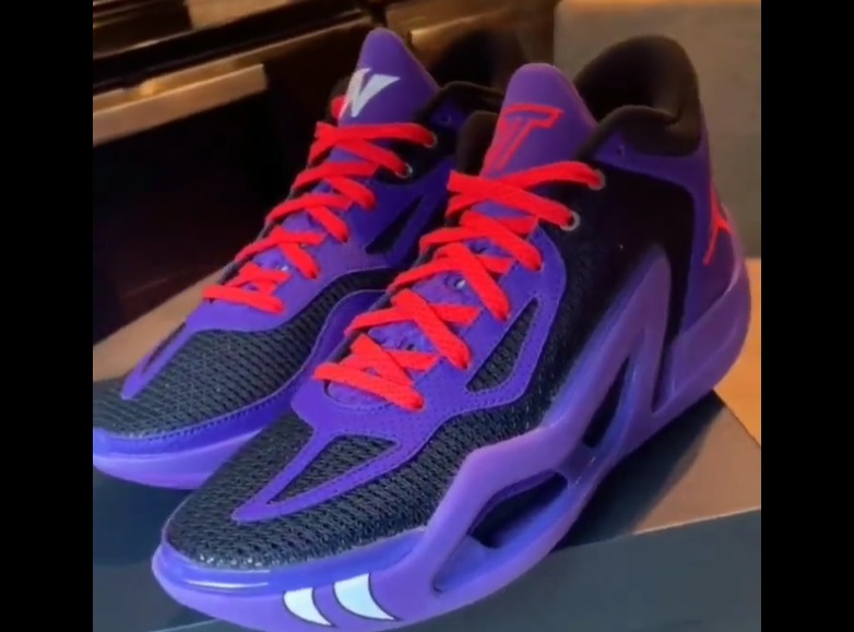 Relayée par Slam Kicks, la vidéo de la JT 1 “Raptors”, aux couleurs de la franchise de Toronto au début des années 2000, montre une tige en violet et noir assortie de touches de rouge pour faire ressortir le “Jumpman”, la signature du joueur de Boston ou encore les lacets. On distingue également en blanc les initiales de Kia Nurse en évidence sur l’empeigne et la languette de la chaussure droite en blanc, les contours du logo “JT” apparaissant en rouge sur la languette de la chaussure gauche.