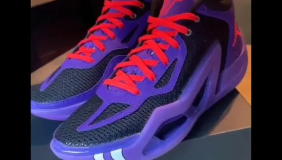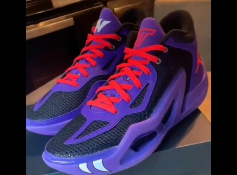Relayée par Slam Kicks, la vidéo de la JT 1 “Raptors”, aux couleurs de la franchise de Toronto au début des années 2000, montre une tige en violet et noir assortie de touches de rouge pour faire ressortir le “Jumpman”, la signature du joueur de Boston ou encore les lacets. On distingue également en blanc les initiales de Kia Nurse en évidence sur l'empeigne et la languette de la chaussure droite en blanc, les contours du logo “JT” apparaissant en rouge sur la languette de la chaussure gauche.