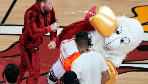 Mais qu’est ce qui a pris Conor McGregor de frapper “Burnie” aussi fort !? Lors d’une mise en scène organisée à la mi-temps du Game 4 entre Miami et Denver pour faire la promotion d’un spray anti-douleur, la mascotte du Heat s’est retrouvée à affronter Conor McGregor pour un pseudo-combat.