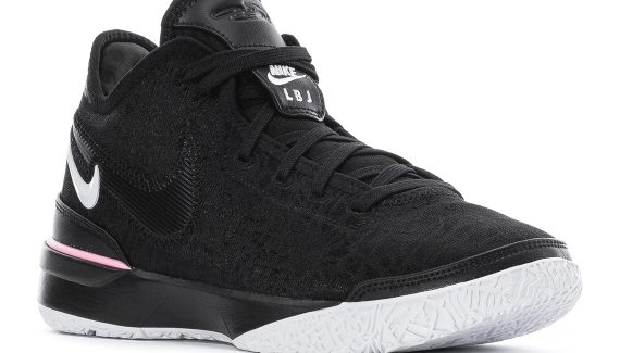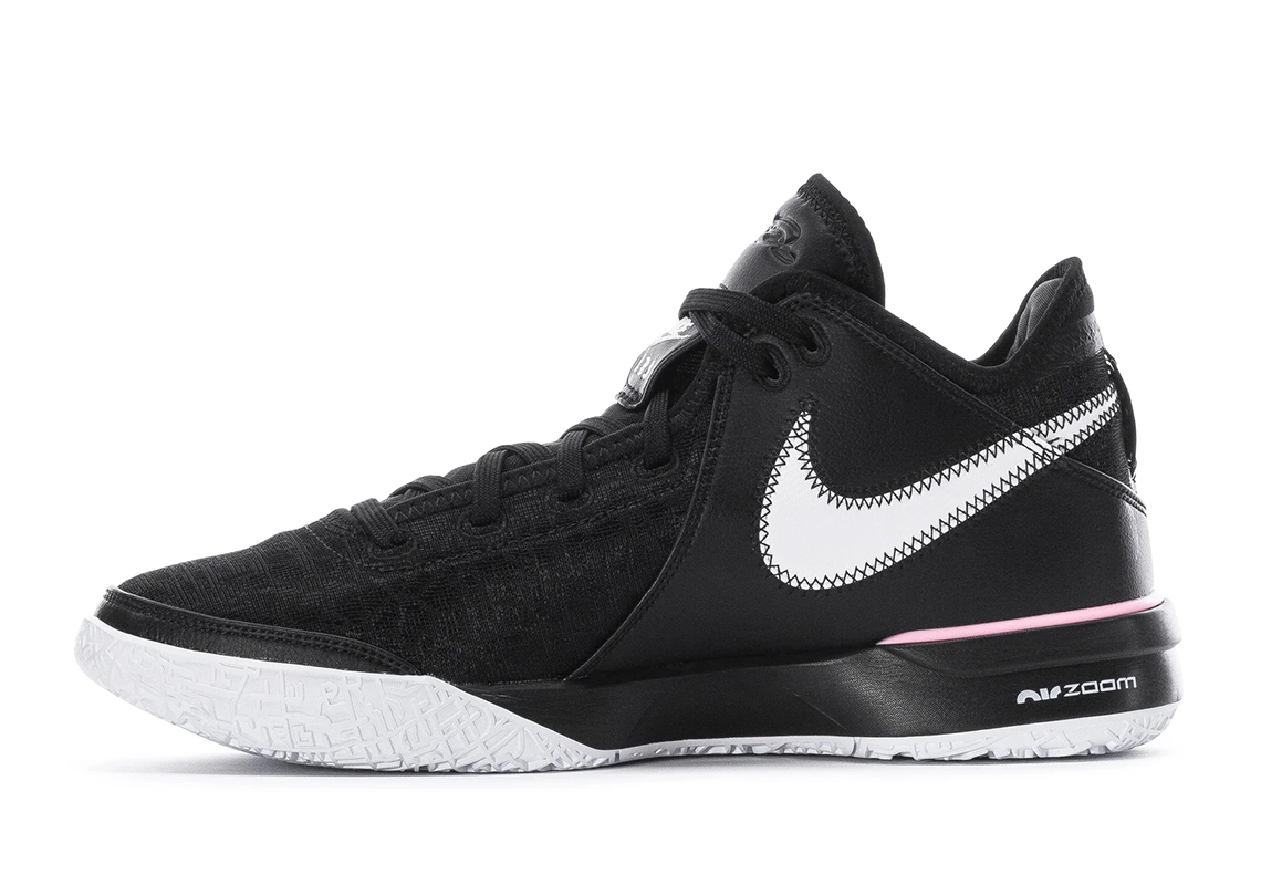 La tige en mesh noir comporte également un “Swoosh” noir et deux autres virgules de couleur blanche sur son empeigne. La tige, également en noir, laisse apparaître la signature de LeBron James et l’inscription “NIKE LBJ” sur la partie en cuir. On retrouve également une touche de rose à la base du talon, tandis que la semelle ressort en blanc.