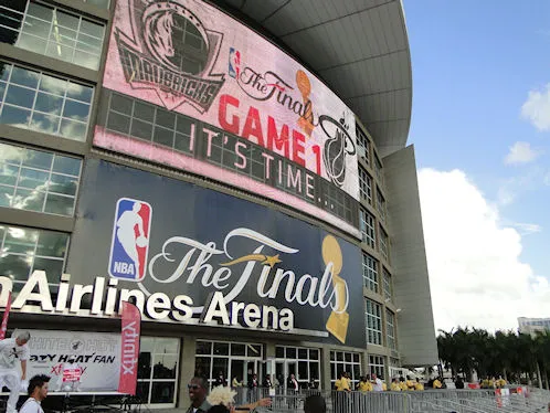 Grand soleil à Miami, et aux abords de la salle, une ambiance bon enfant. Certains ont fait le déplacement depuis Dallas pour encourager les Mavs. Notez d'ailleurs le magnifique T-Shirt “White Mamba” à la gloire de Dirk.