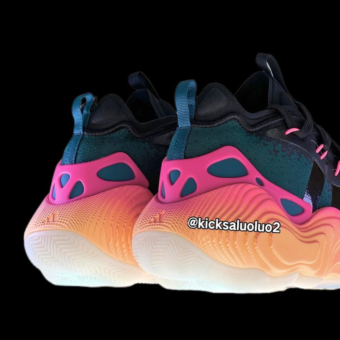 Adidas a opté pour un nouveau design pour cette troisième chaussure signature, avec une tige en textile léger, ici en noir, et surtout une semelle intermédiaire imposante sur un dégradé allant du jaune au rose, d’une mousse dont la composition reste à être détaillée, reposant sur une semelle extérieure en caoutchouc translucide.