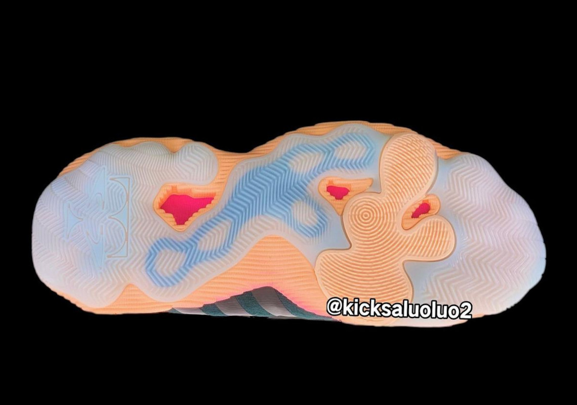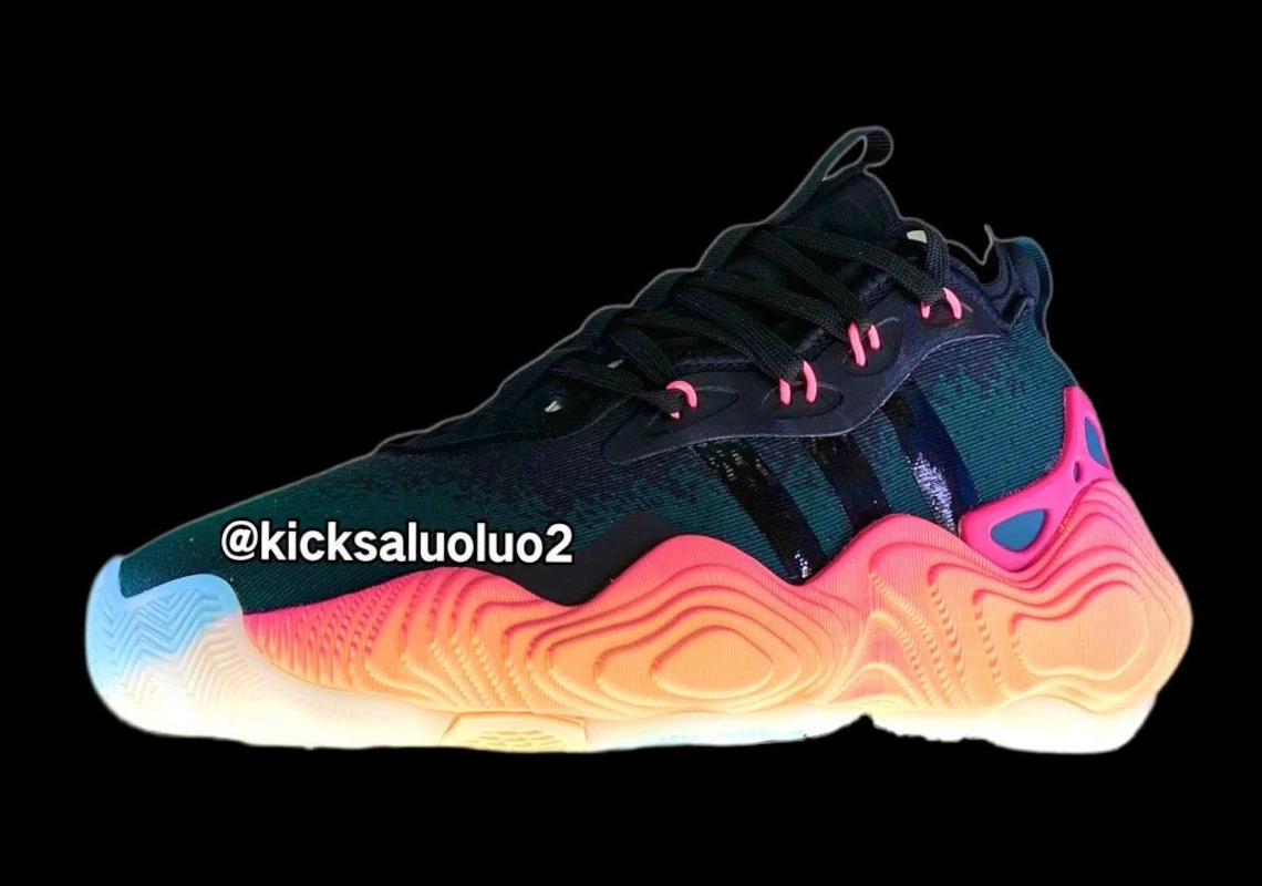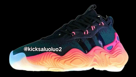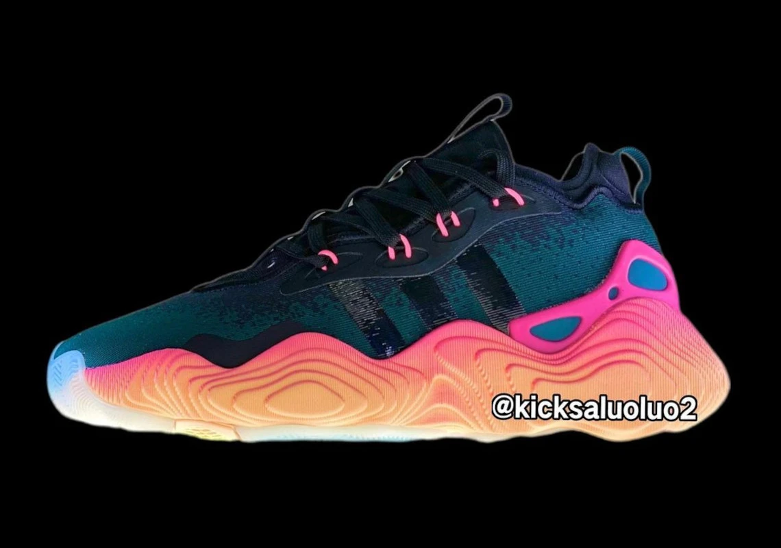 Adidas a opté pour un nouveau design pour cette troisième chaussure signature, avec une tige en textile léger, ici en noir, et surtout une semelle intermédiaire imposante sur un dégradé allant du jaune au rose, d’une mousse dont la composition reste à être détaillée, reposant sur une semelle extérieure en caoutchouc translucide.