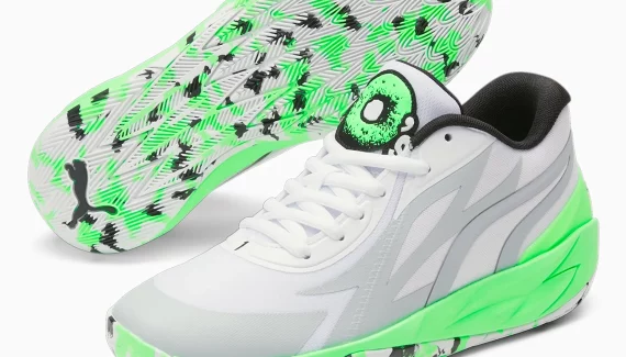 Le premier coloris “LaMel-O” est inspiré des céréales préférées du meneur des Hornets et également tiré d’un clip publicitaire réalisé pour la marque Hulu l’an dernier. On retrouve une tige blanche sur laquelle les finitions apparaissent en gris et noir. La semelle intermédiaire en vert clair repose sur une semelle extérieure dans un style marbré en blanc, noir et vert. Les deux motifs présents sur la languette font également référence au spot publicitaire, avec le visage dessiné de LaMelo Ball et un gros “O” en forme de céréale, ressortant en vert.