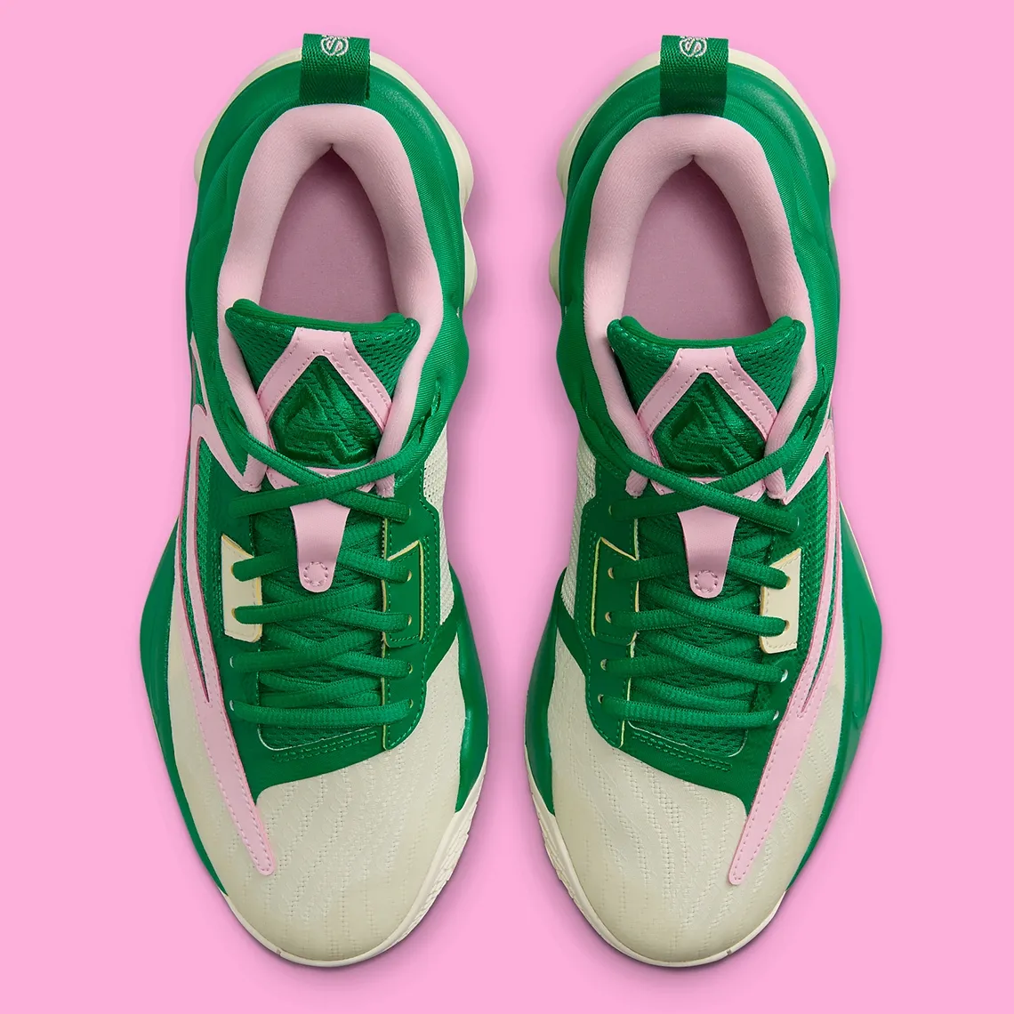 Le rose se prolonge sur la languette, le col et la tirette où figure l'inscription « Giannis », tandis que la semelle, au style désormais reconnaissable, apparaît en vert et blanc cassé.
