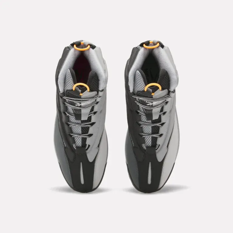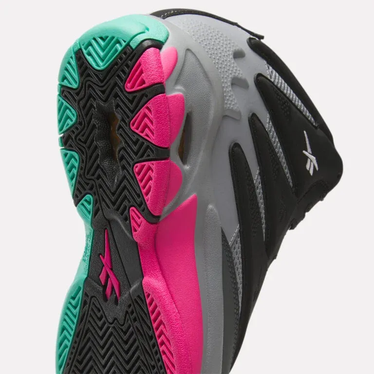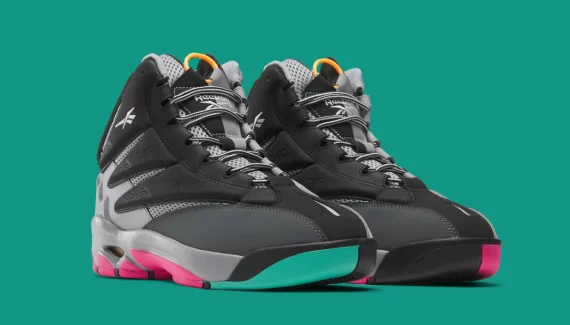Plus de 25 ans après sa sortie, la Reebok « The Blast » se présente ainsi avec une tige en noir et gris complétée par des touches de turquoise et rose sur la semelle. On note aussi du orange sur les anneaux composant la tirette et la languette.