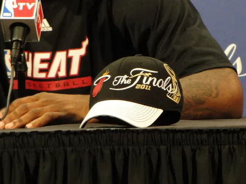 Sauf que les têtes pensantes de la NBA ont eu l'idée de poser deux casquettes sur la table derrière laquelle s'assoient les joueurs en conférence de presse, de chaque côté du micro. Lorsque LeBron James répond aux journalistes, les casquettes du Heat sont ainsi bien visibles.