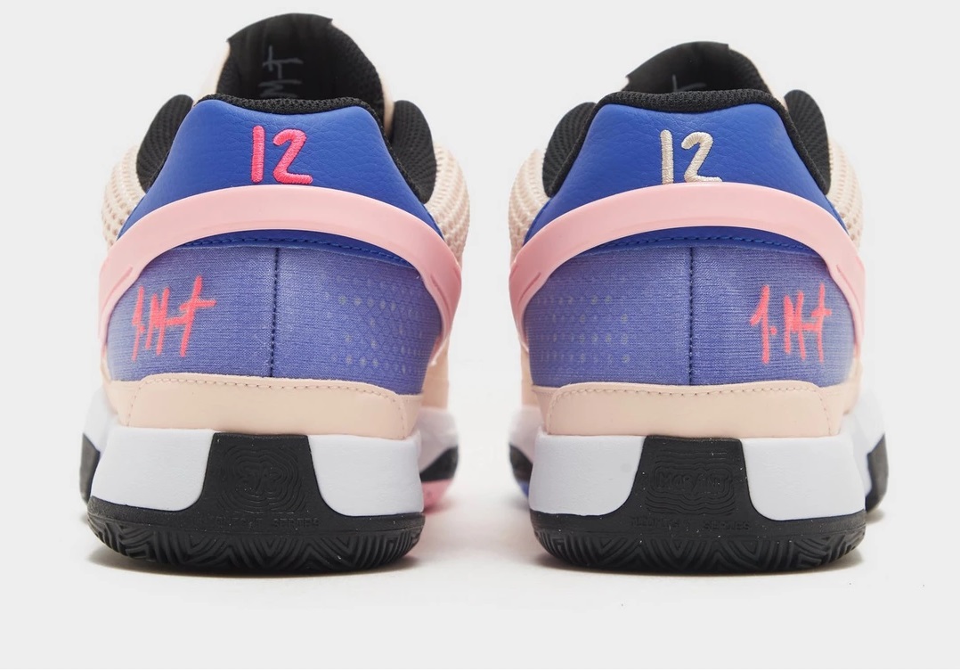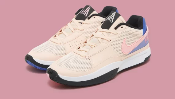 La tige beige est complétée par un “Swoosh” rose pastel tandis que la partie arrière de la chaussure apparaît en violet. Le col et l’étiquette présente sur la languette sont habillés en noir. La semelle opte pour sa part pour un mariage noir, blanc, violet et rose. En espérant plus d’infos (ou de nouveaux coloris) dans les semaines à venir concernant la Ja 1 et le dénouement autour de sa possible sortie.