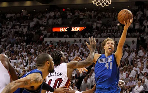 Il reste 3 secondes. Miami joue vite. C'est Dwyane Wade qui tente le shoot de la gagne. Il est à 8 mètres. On y croit. Mais la balle frappe le cercle, et Dirk Nowitzki peut lever les bras au ciel.